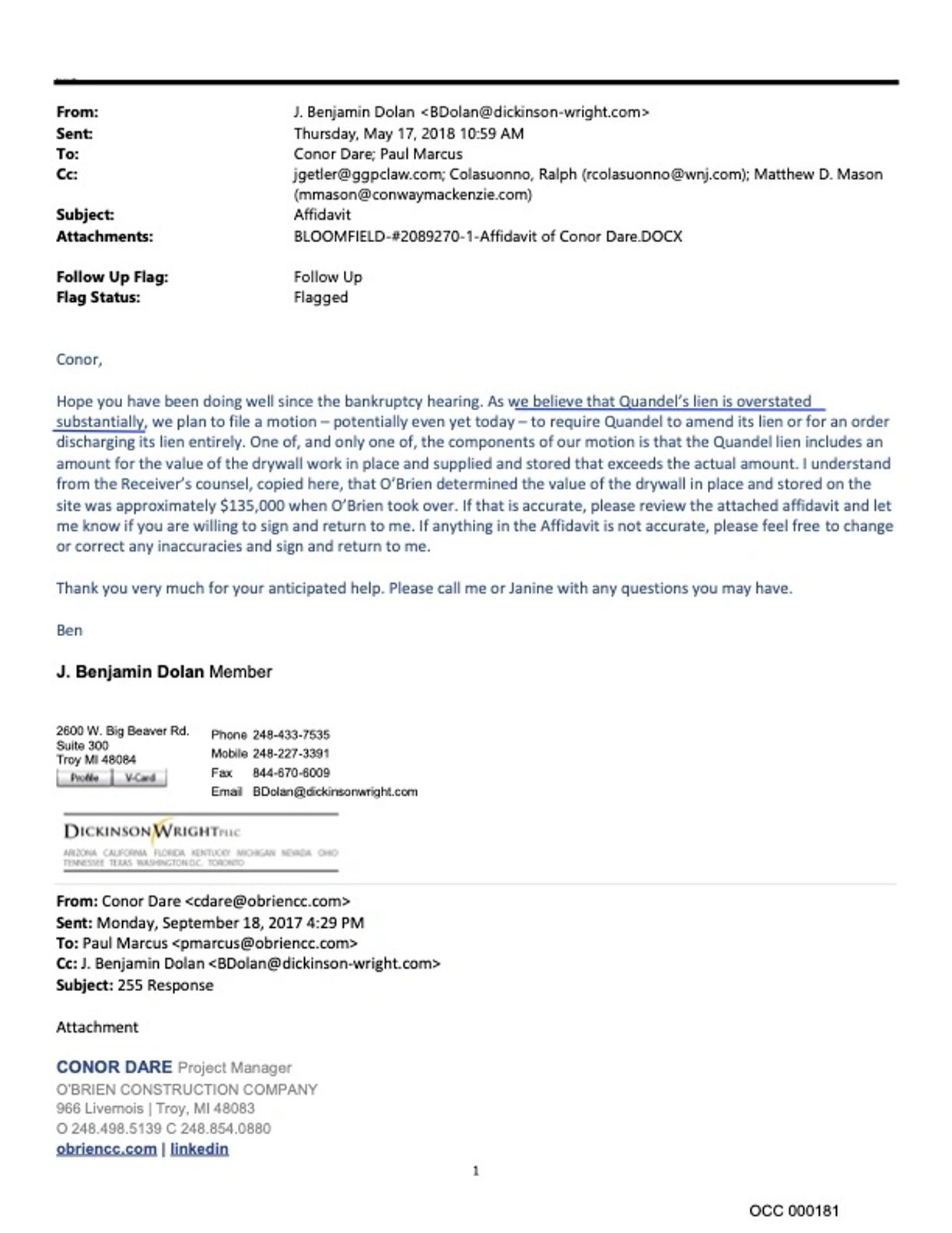 Dolan wrote, “As we believe Quandel’s lien is overstated substantially, we plan to file a motion – potentially even yet today – to require Quandel to amend its lien or for an order discharging its lien entirely.”