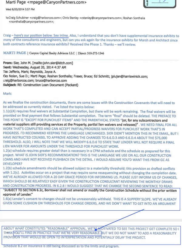 On construction projects, lenders approve draw requests on a daily basis. Simple emails are normally exchanged in this regard. At Canyon, in-house and outside lawyers approve the most routine emails because it seems that Canyon is always preparing for litigation.